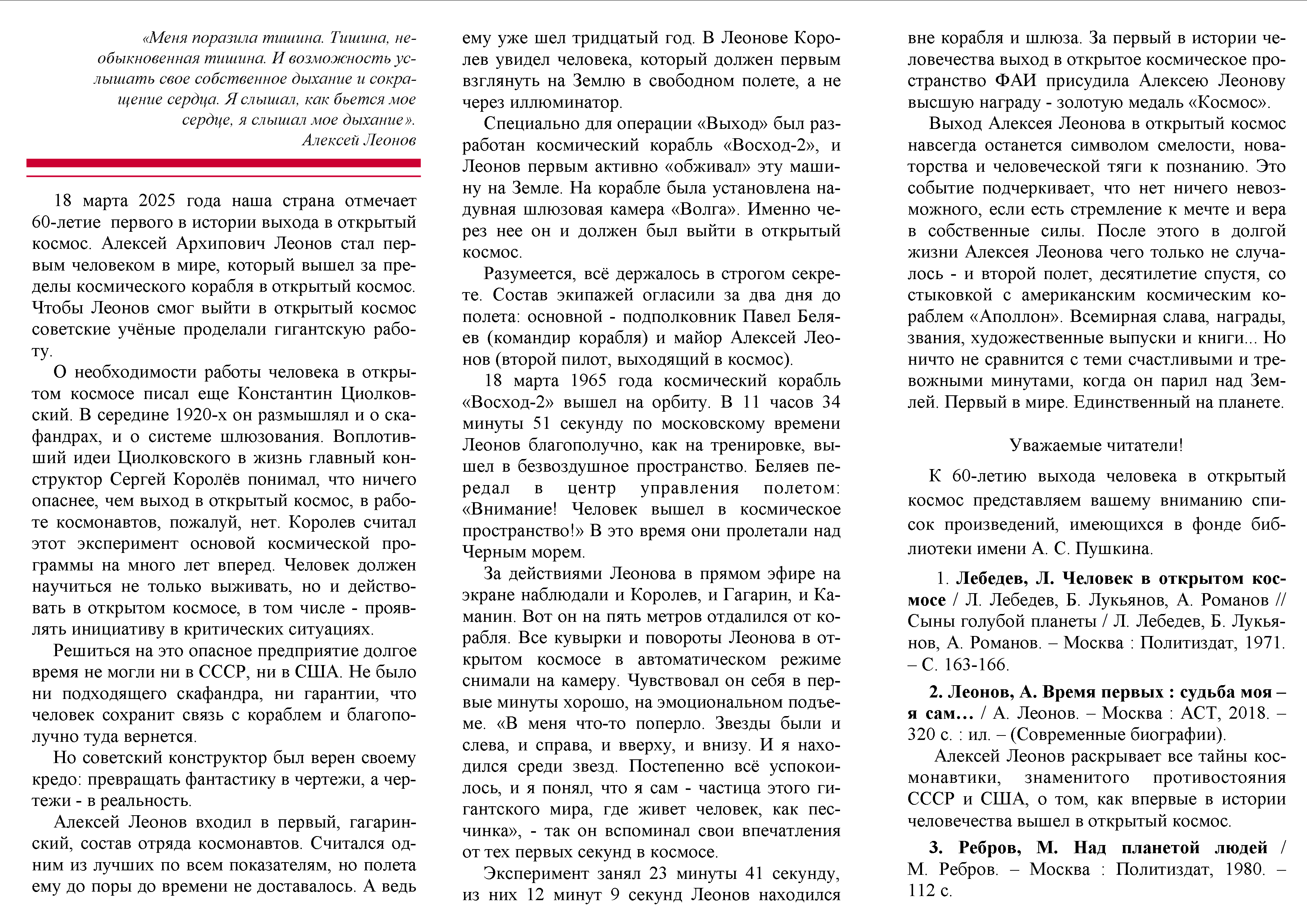 Первый в открытом космосе : к 60-летию выхода человека в открытый космос