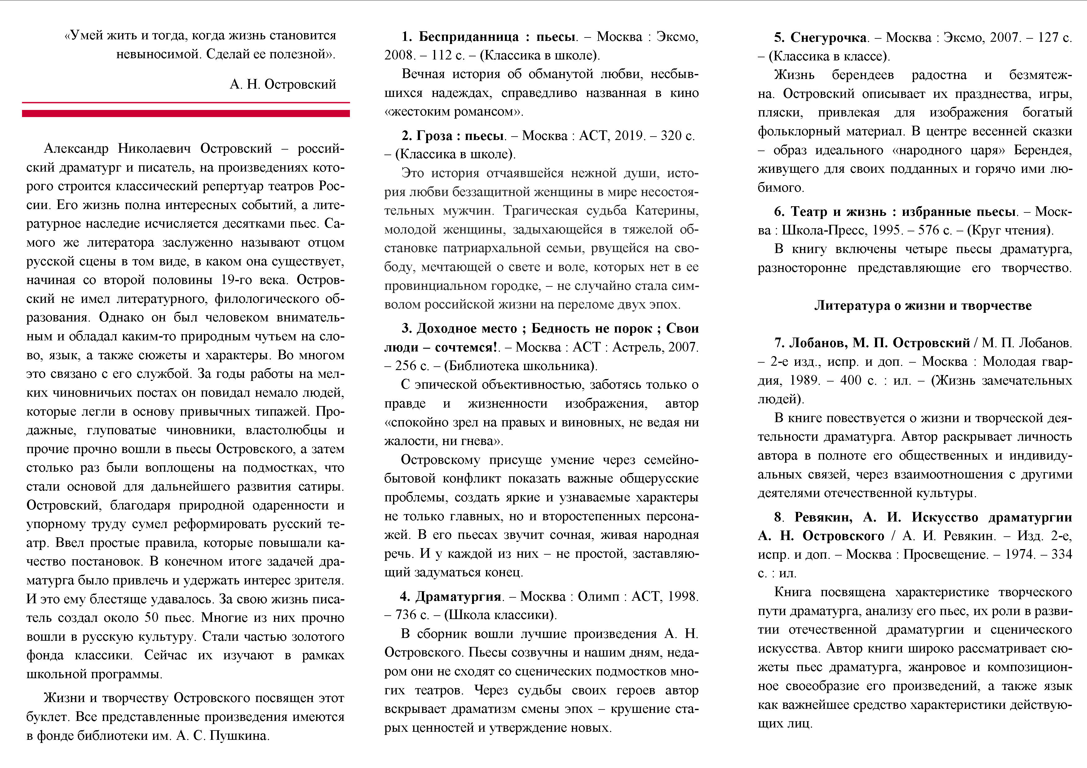 Библиографическая памятка к 200-летию А. Н. Островского