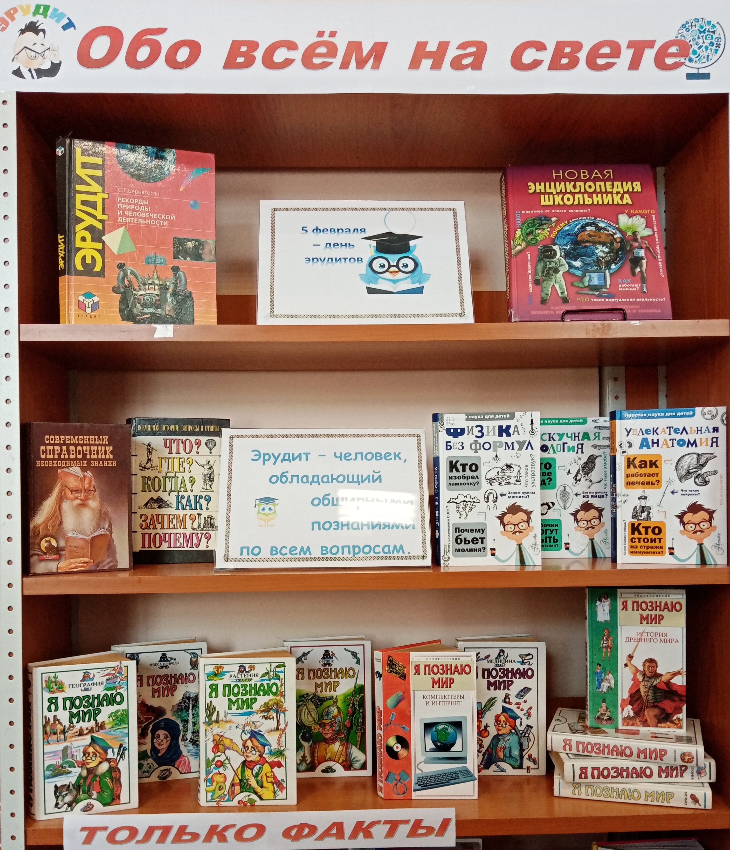 В эпоху интернета, где ответы на вопросы доступны в один клик, эрудиция приобретает особое значение. Безусловно, развить эрудицию помогают книги и чтение. Поэтому, приглашаем вас посетить выставку-просмотр на абонементе нашей библиотеки «Обо всём на свете». Она состоит из двух разделов «Только факты» и «Очень интересно всё то, что неизвестно», где представлен большой выбор познавательной литературы по разным отраслям знаний. Эти книги познакомят вас с невероятными интересными фактами из истории техники, о тайнах природы, о рекордах животных. Посетив её, вы сможете окунуться в мир эрудиции и побродить по лабиринтам разума.