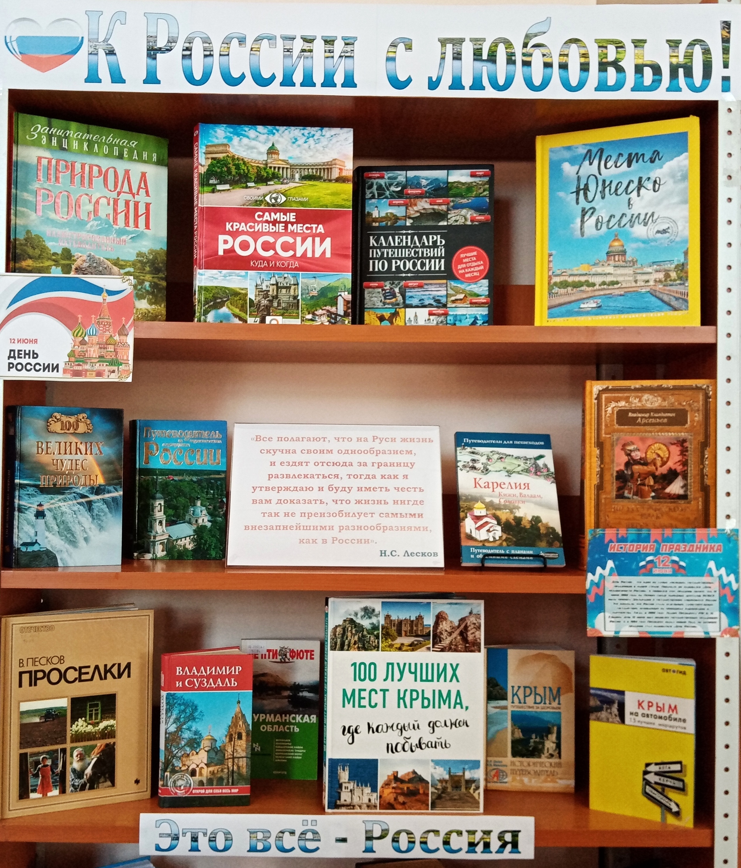 Друзья! В честь Дня России, который наша страна отмечает 12 июня, сотрудники абонемента библиотеки предлагают всем желающим отправиться в книгопутешествие по удивительным местам и городам нашей Родины. Ведь Россия необъятна, уникальна и полна настоящих чудес, о которых не все даже слышали. Тысячи городов Отчизны – самых красивых и исторически значимых – ждут Вас на страницах книг, представленных на выставке-путешествии.