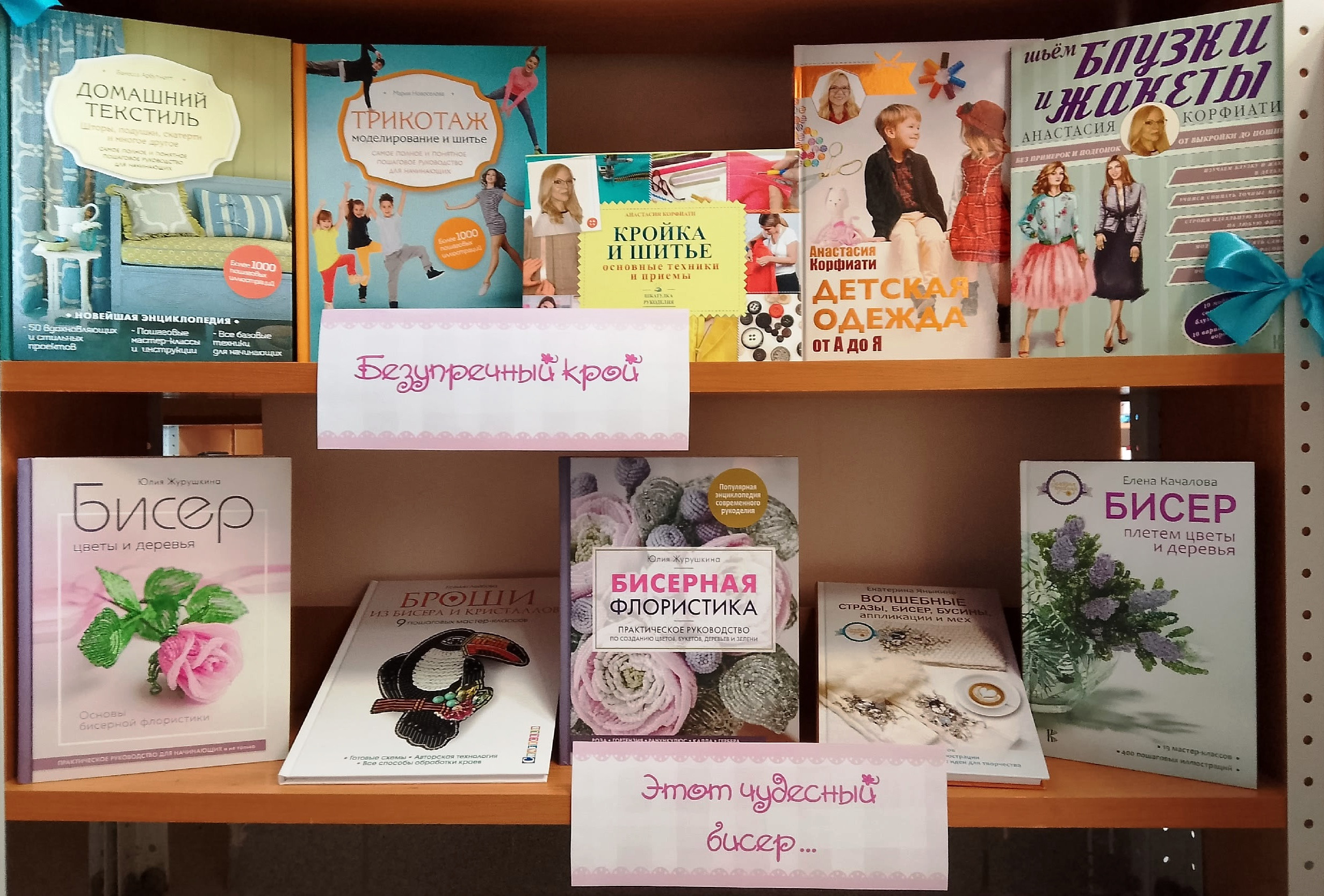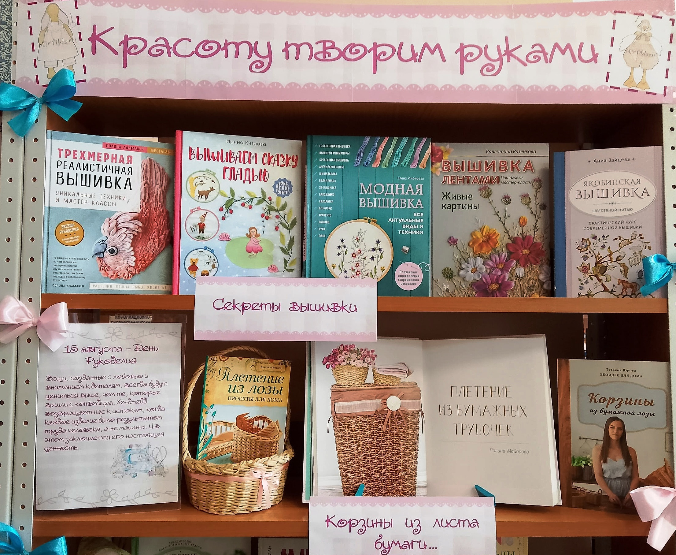 В нашей библиотеке в честь Всемирного дня рукоделия открылась красочная книжная выставка «Красоту творим руками». На ней представлены яркие современные издания, содержащие в себе точные схемы, простые выкройки и подробные описания изготовления изделий. Всего выставка включает в себя шесть разделов о различных видах рукоделия: «Секреты вышивки», «Корзины из листа бумаги», «Прекрасные текстильные куклы», Теплое кружево», «Безупречный крой», «Этот чудесный бисер».