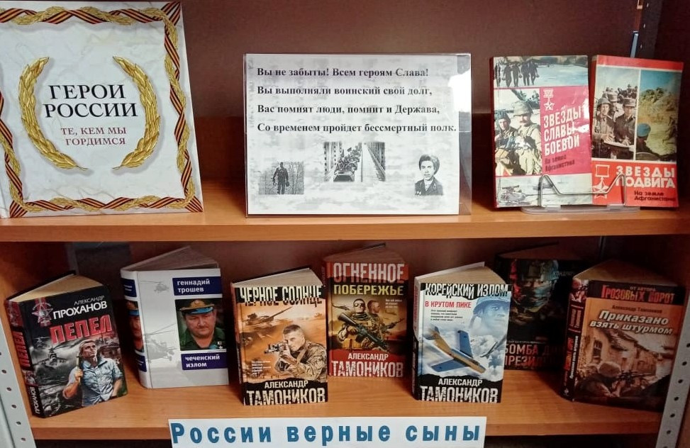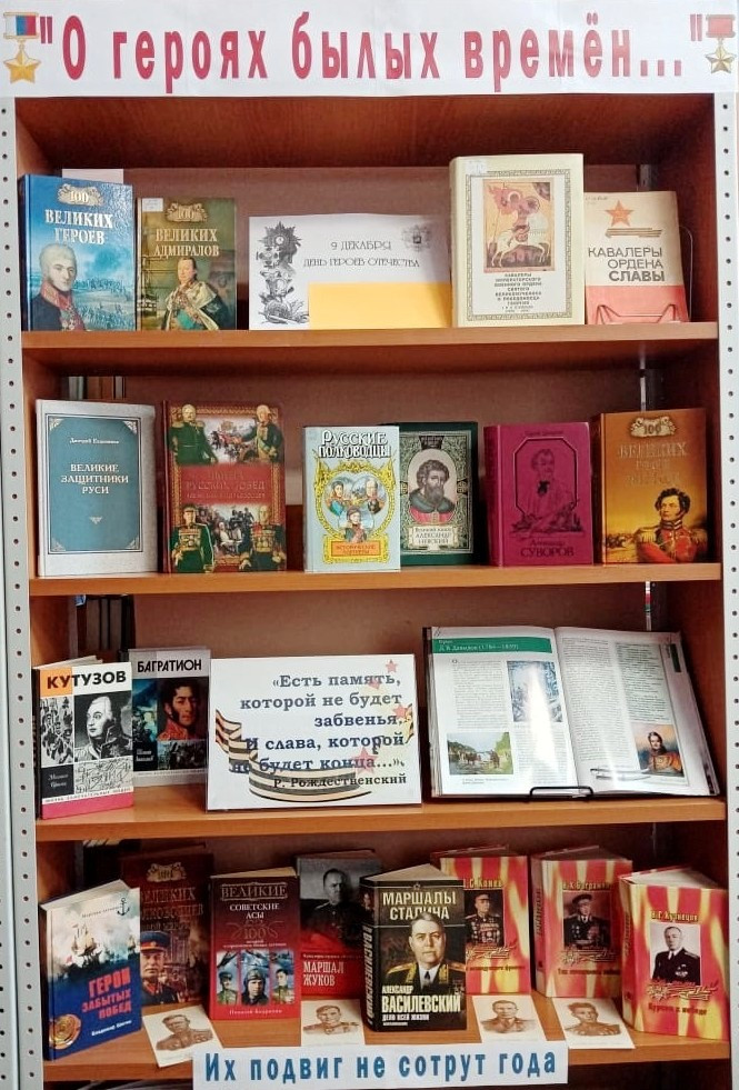 К этой дате на абонементе нашей библиотеки подготовлена книжная выставка-память «О героях былых времён…». Она состоит из двух разделов – это «Их подвиг не сотрут года» и «России верные сыны».