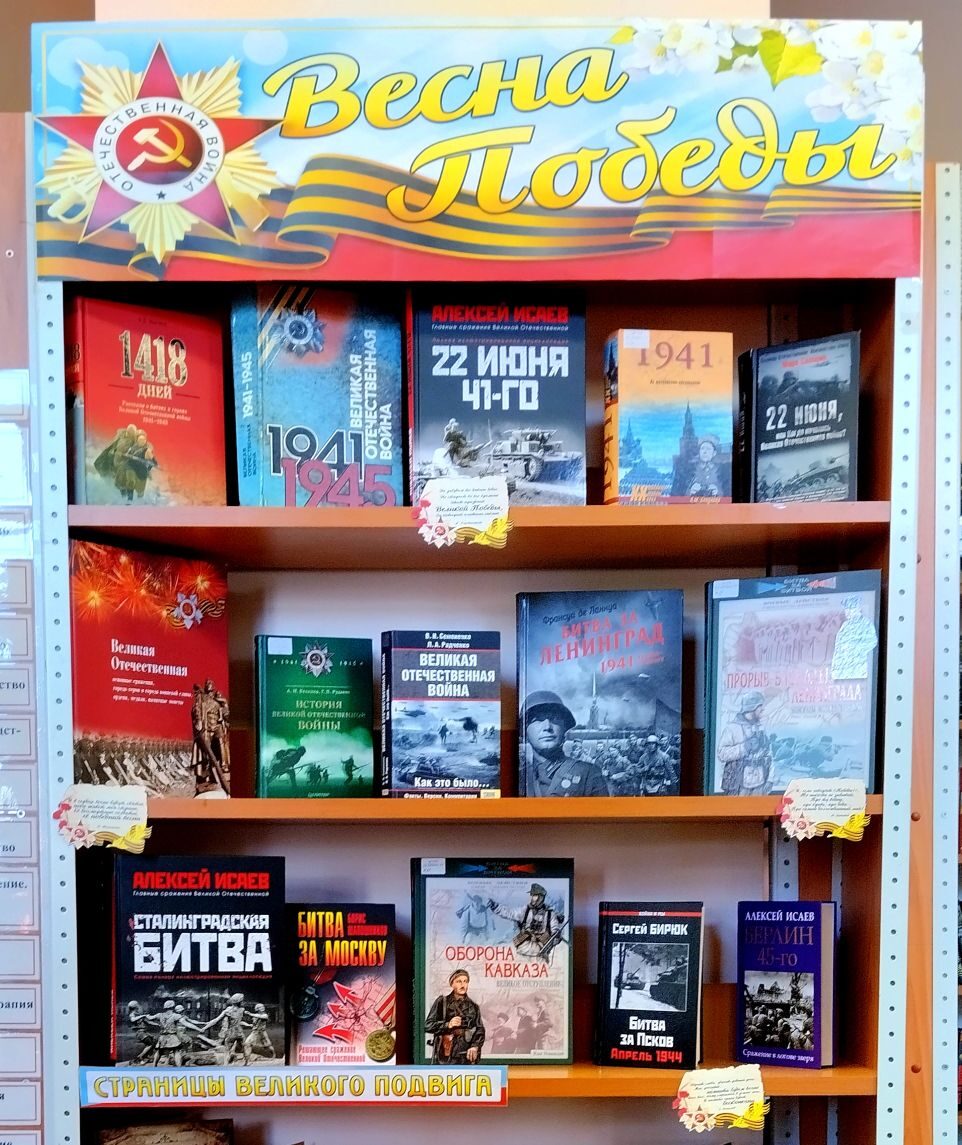 На абонементе ЦГБ им. А.С. Пушкина подготовлена книжная выставка. Представленные книги рассказывают о беззаветном героизме, о подвигах совершенных нашими людьми во имя Родины и ради защиты всего того, что было нам дорого и свято. Письма с фронта, сухие строчки приказов и документов, фотографии военных лет доносят до нас свидетельства очевидцев и участников войны.