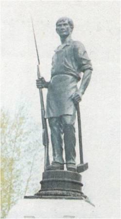 Трехметровая фигура рабочего с винтовкой и молотом отлита на Каслинском чугунно-литейном заводе. Скульптор К.А. Клодт, исполнители проекта мемориала Д.И. Попов и В.П. Домрачев.